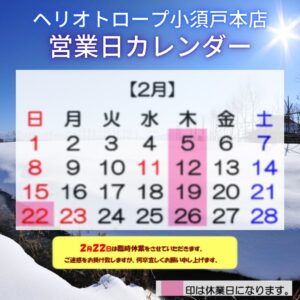 2026/02/01 寒い日が続いていますがいかがお過ごしでしょうか。 寒い時期こそ、温かな酵素に包まれてほっこりしてくださいませ☆彡 当店は≪2月22日(日)≫を臨時休業させていただきます。 ご迷惑をお掛けしますが、何卒よろしくお願いいたします。